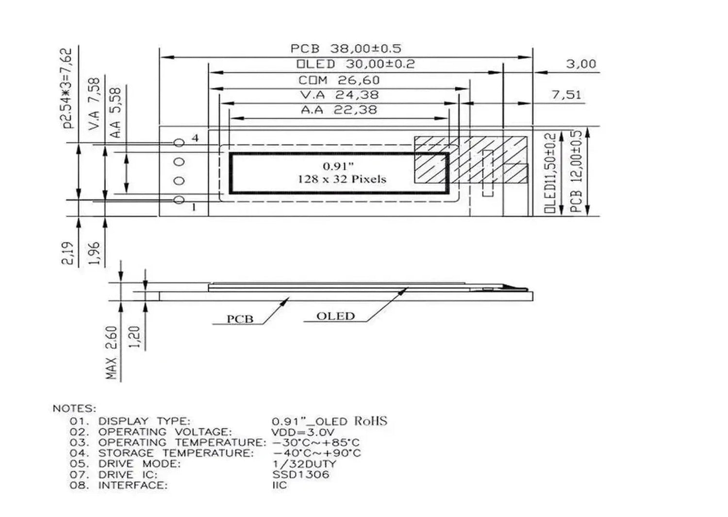 Specifikationer för I2C 128 x 32 pixlar OLED-skärm (vit).