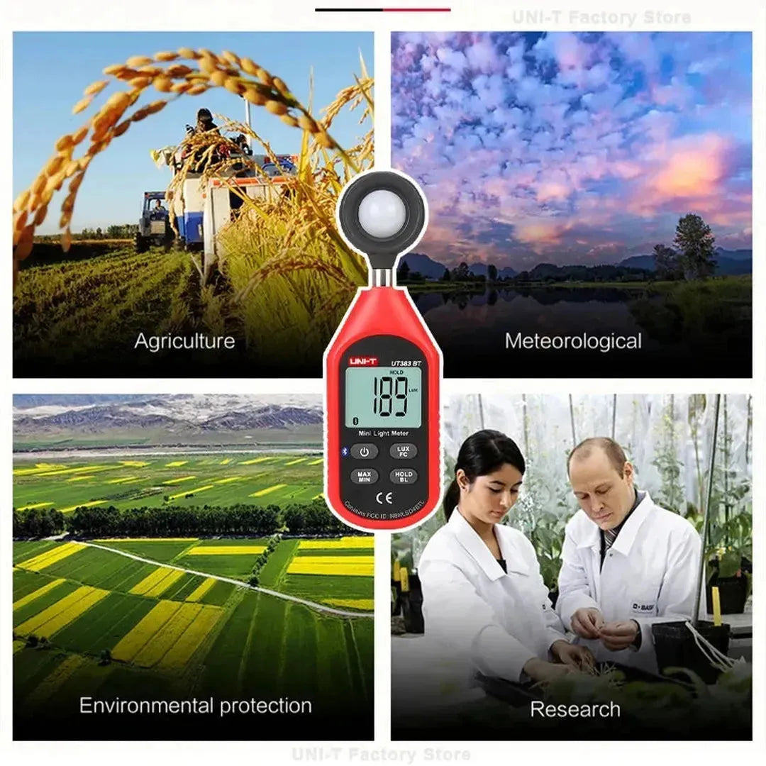 UNI-T UT383 och UT383BT är professionella luxometrar designade för exakt ljusmätning inom olika områden. UT383BT-modellen erbjuder ytterligare Bluetooth-anslutning för dataöverföring.